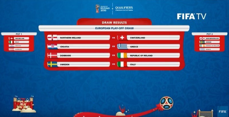 در  سیدبندی قرعه‌کشی پلی‌آف جام جهانی 2018 روسیه، بر اساس رده‌بندی اخیر فیفا در ماه اکتبر، تیم‌های ایتالیا، دانمارک، سوئیس و  کرواسی در سید یک و تیم‌های سوئد، ایرلندشمالی، ایرلند جنوبی و یونان در سید دوم قرار داشتند.