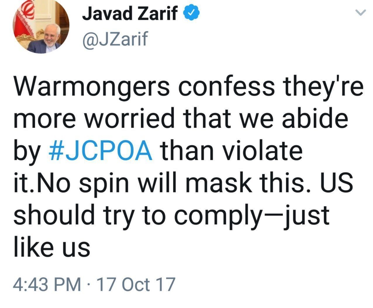 به گزارش گروه بینالملل خبرگزاری تسنیم، "محمد جواد ظریف" وزیر امور خارجه ایران در توئیتی اعلام کرد که جنگ طلبان اعتراف کردند که بیشتر نگران رعایت برجام توسط ایران هستند تا نقض آن توسط ایران (اشاره به مصاحبه یکشنبه نتانیاهو) هیچ بازی تبلیغاتی نمی تواند این واقعیت را بپوشاند. آمریکا باید سعی کند تعهداتش را اجرا کند، درست مثل ایران.