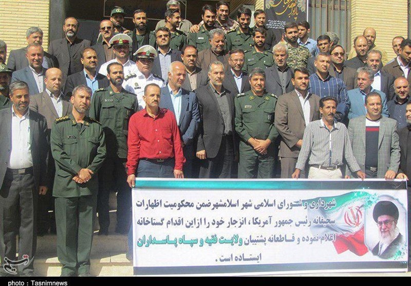 همچنین به دنبال سخنان اهانتآمیز ترامپ، اقشار و گروههای مختلف، کارکنان ادارات دولتی، کسبه و اصناف اسلامشهر با نصب پلاکارد، دستنوشته، بنر، تجمع در محلهای مختلف و با حضور در پایگاهها و حوزههای مقاومت بسیج این شهرستان اتحاد و انسجام خود را به نمایش گذاشتند.