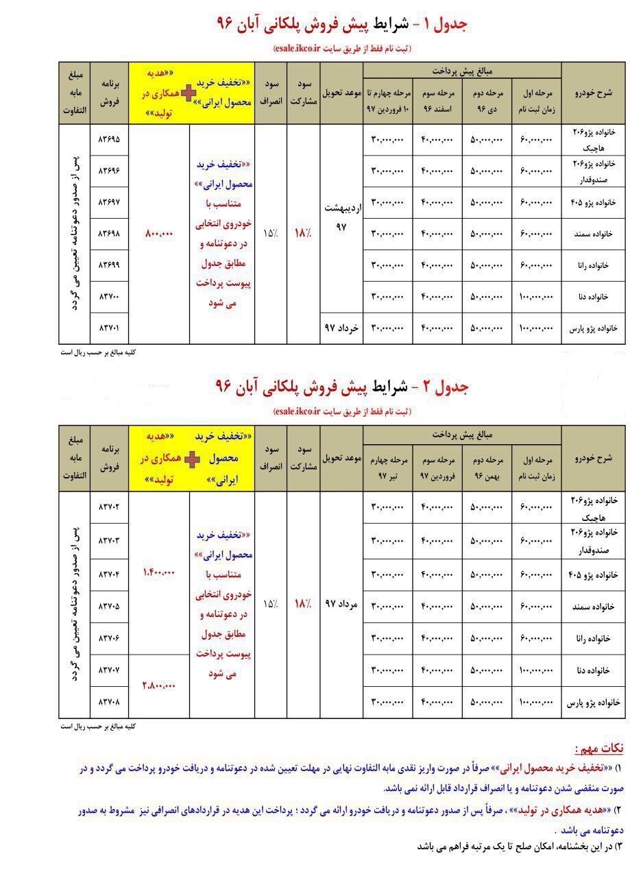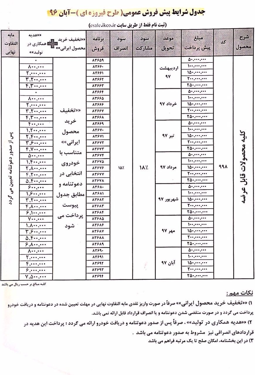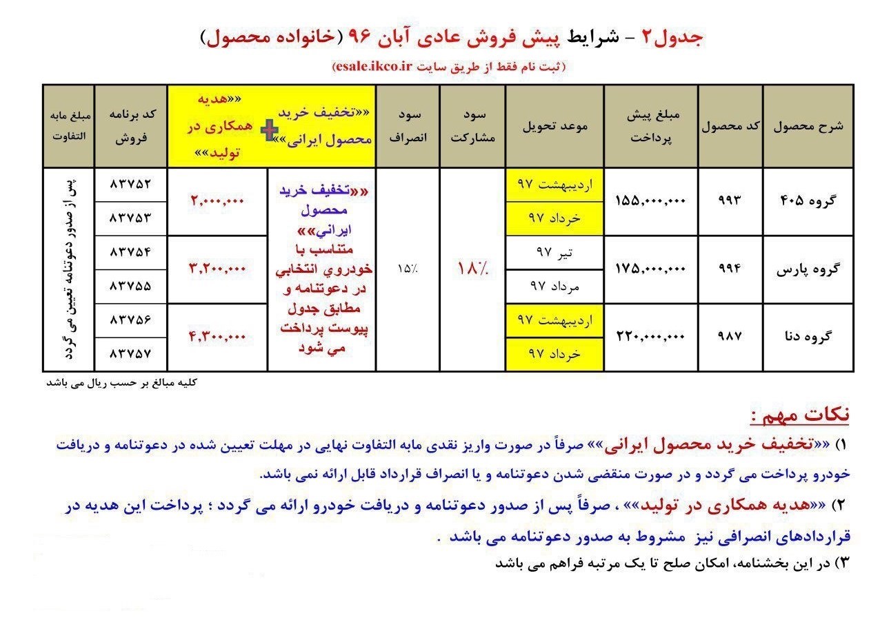 به گزارش خبرنگار اقتصادی خبرگزاری تسنیم، در شرایط پیش‌فروش عادی آبان ماه ایران خودرو تخفیف خرید محصول ایرانی صرفاً در صورت واریز نقدی مابه‌التفاوت نهایی در مهلت تعیین‌شده در دعوت‌نامه و دریافت خودرو پرداخت می‌گردد و در صورت منقضی شدن دعوت‌نامه و یا انصراف قرارداد قابل ارائه نمی‌باشد. همچنین هدیه همکاری در تولید صرفاً پس از صدور دعوت‌نامه و دریافت خودرو ارائه می‌شود. پرداخت این هدیه در قراردادهای انصرافی نیز مشروط به صدور دعوت‌نامه هست. در بخشنامه پیش‌فروش عادی محصولات 405، پارس، دنا امکان صلح تا یک مرتبه فراهم است.