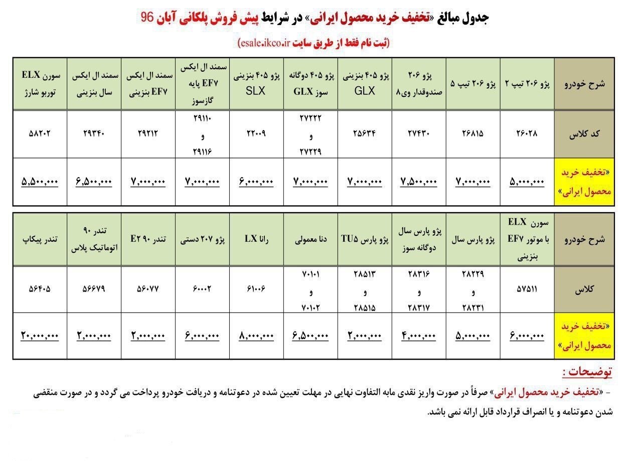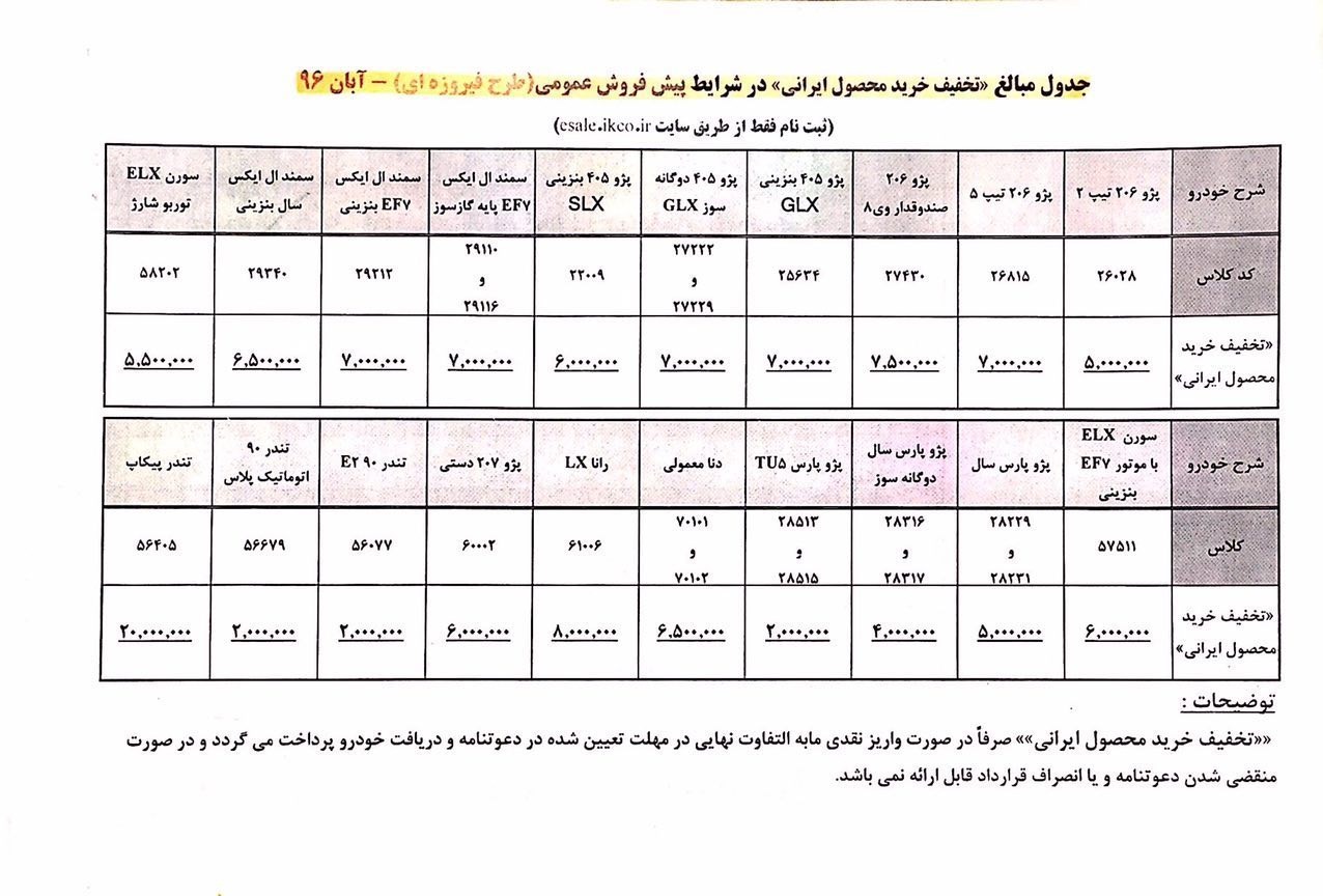 جزئیات فروش عادی و پلکانی انواع محصولات ایران خودرو به‌شرح زیر است: