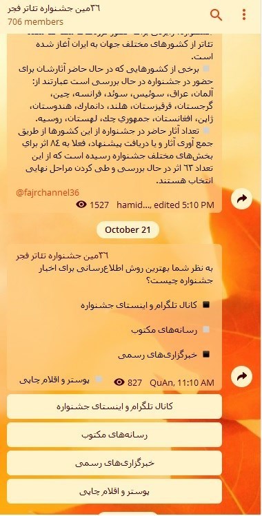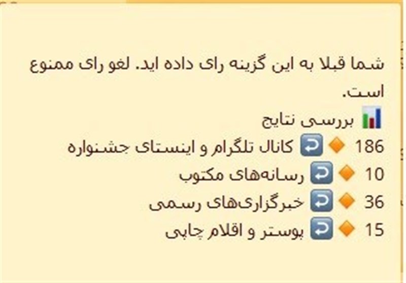 همانطور که میبینید تنها 247 نفر در آن شرکت کردهاند. یعنی 30درصد از افرادی که نظرسنجی را دیده در آن شرکت کردهاند. به عبارت دیگر استقبال از این کانال نه تنها ضعیف بود که استقبال از نظرسنجی نیز ضعیفتر بوده است. باید در اینجا کمی مکث کنیم. در جشنواره فجر سال گذشته بیش از 100 اثر شرکت کرده که حداقل هر گروه نزدیک به 10 نفر عضو دارد. بماند که هر اجرا نیز میانگین تعدادی مخاطب دارد که بستگی به سالن اجرا داشته و میتوان برای آن عدد x را در نظر بگیریم. پس جشنواره فجر برای 706 نفری نیست که عمدتاً از اعضای برگزاری جشنواره به حساب میآید و این عدد از عدد 1000+x به مراتب کمتر است، پس مشروعیت نظرسنجی زیرسؤال میرود.