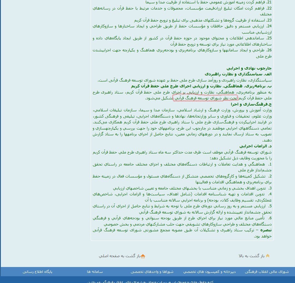 پیش از این در بند (ب) بخش «چارچوب نهادی و اجرایی» نسخهای از سند طرح ملی حفظ قرآن که در سایت شورا منتشر شده بود، آمده بود: به منظور برنامهریزی، هماهنگی، نظارت و ارزیابی بر اجرای طرح ملی حفظ قرآن کریم، ستاد راهبری طرح ملی حفظ قرآن کریم تحت نظر دبیرخانه شورای توسعه فرهنگ قرآنی تشکیل میشود.