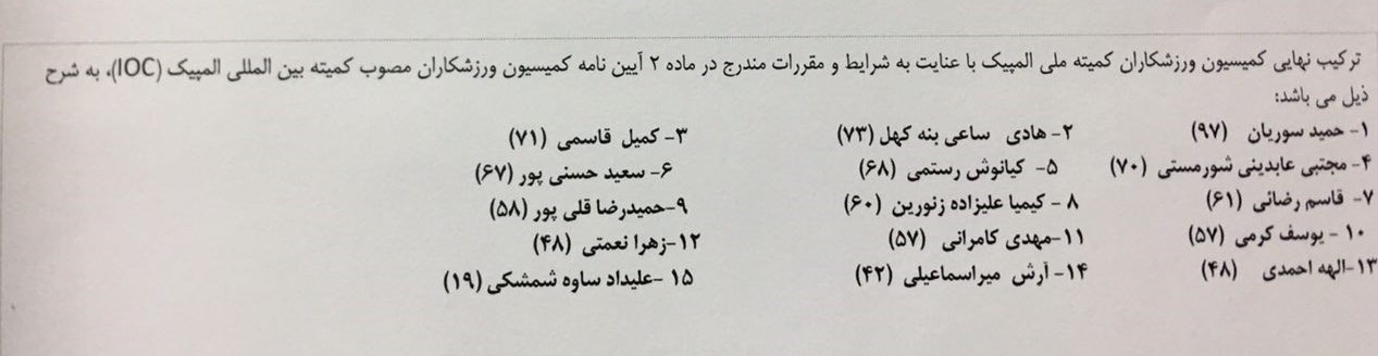 15 نفر نهایی از کشتی، وزنهبرداری، تکواندو، شمشیربازی، کاراته، بسکتبال، تیراندازی، جودو و اسکی انتخاب شدند.