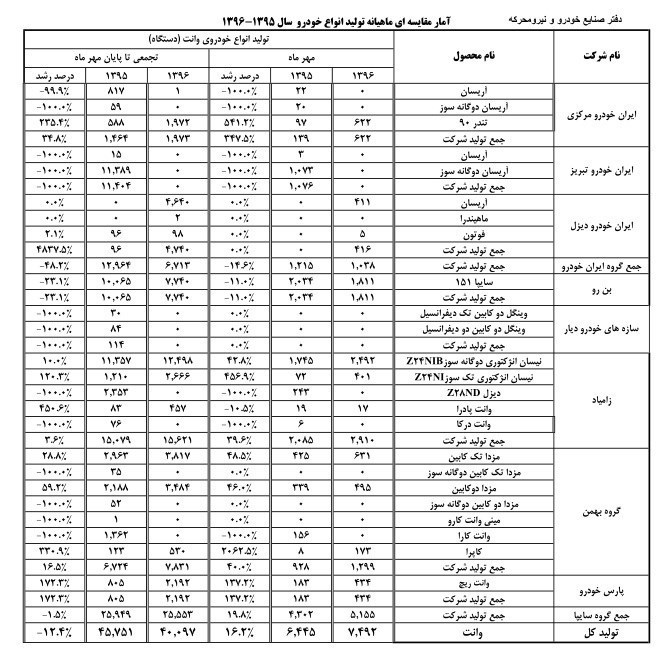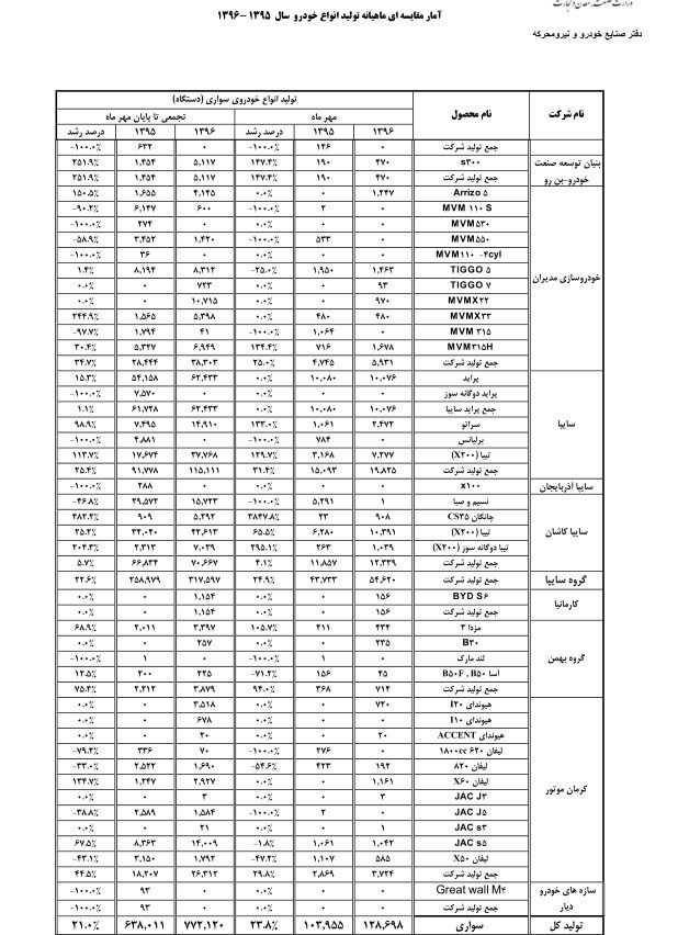 آمار تولید انواع خودرو تا پایان مهر ماه امسال به شرح زیر است: