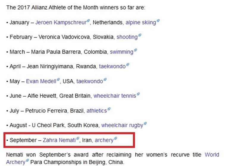 در بخش انتهایی این خبر اسامی بهترین ورزشکاران هر ماه در سال 2017 دیده میشود که در بین آنها نام زهرا نعمتی نیز وجود دارد. نعمتی روز 13 مهر ماه از سوی IPC به عنوان یکی از پنج نامزد کسب عنوان بهترین ورزشکار معلول در ماه سپتامبر معرفی کرد، اما نتیجه نهایی این نظرسنجی هرگز منتشر نشد.