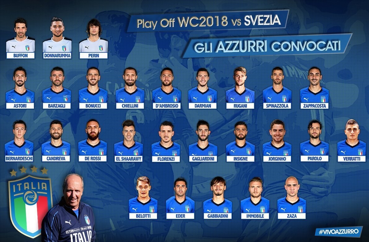 به گزارش خبرگزاری تسنیم، جامپیروی ونتورا، سرمربی تیم ملی ایتالیا اسامی بازیکنانی که برای مصاف رفت و برگشت با سوئد در پلیآف جام جهانی 2018 روسیه دعوت کرده است را اعلام کرد.