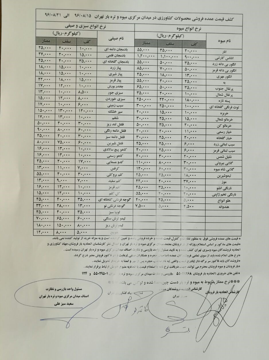 قیمت‌های مذکور بر اساس استعلام روزانه از بارفروشان متعدد میدان مرکزی میوه و تره‌بار تهران و اعمال نظر کارشناسان اتحادیه بارفروشان جهاد کشاورزی و اتحادیه فروشندگان میوه و سبزی تهران کشف شده و به تایید واحدهای بازرسی و نظارت اصناف میدان مرکزی میوه و تره‌بار تهران رسیده است.