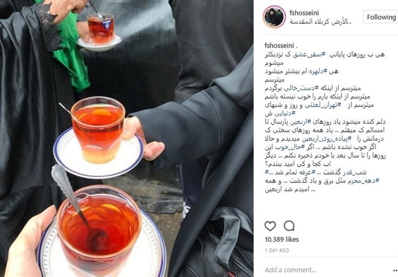 فضه سادات حسینی مجری صداو سیما هم تصاویری از حضورش در راهپیمایی اربعین منتشر می کند او در پستی نوشته است: «هی به روزهای پایانی سفر عشق که نزدیک تر می شوم، هی دلهره‌ام بیشتر می‌شود، می‌ترسم؛ می‌ترسم از اینکه دست خالی برگردم، می‌ترسم از اینکه بارم را خوب نبسته باشم، می‌ترسم از تهران و روز و شب‌های دنیایی‌اش، دلم کنده می‌شود یاد روزهای اربعین پارسال تا امسالم که می‌افتم ... . یاد همه روزهای سختی که درمانش را پیاده‌روی اربعین می‌دیدم و حالا اگر خوب نشده باشم ... اگر حال خوب این روزها را تا سال بعد با خودم ذخیره نکنم ... دیگر به کجا و کی امید ببندم؟!