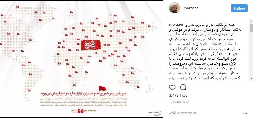 حجت‌الاسلام زائری، روحانی و فعال فرهنگی در صفحه اینستاگرام خود نوشته است: «همه کربلایند، پدر و مادرم، پسر و دخترم، بستگان و دوستان ... هر کدام در موکبی و پای عمودی هستند و من اینجا جامانده‌ام در عمود حسرت! دلخوش به کرامت و بزرگواری آسمانیان که شاید ناله‌های شبانه منبرم را به حساب قدم‌های پیاده روزانه مسیر کربلا بگذارند! دیروز فرزانه‌ای که توفیق سفر نیافته بود می‌گفت چون نتوانسته‌ام به کربلا بروم نیت کرده‌ام با کاری نیکو و خدمتی شایسته این محرومیت را جبران کنم و با خودم قرار گذاشته‌ام که مثلا میزان پیشرفت خودم در این کار را هم محاسبه کنم و مثلا بگویم امروز تا عمود چندم رسیده‌ام! یعنی زندگی روزانه‌ام می‌تواند پیاده‌روی حسینی باشد، با راستگویی و امانتداری‌، با اخلاق و انصاف، با خدمت و کسب حلال، با محبت و احسان به مردم، با رسیدگی به محرومان و ایتام، با نیکی به پدر و مادر، با احوالپرسی از بستگان و اعضای خانواده، با عبادت و دعا و نماز اول وقت، با آدم شدن و انسان بودن و ... . راستی هر کدام از ما امروز در پیاده‌روی زندگی حسینی به کدام عمود رسیده‌ایم؟»