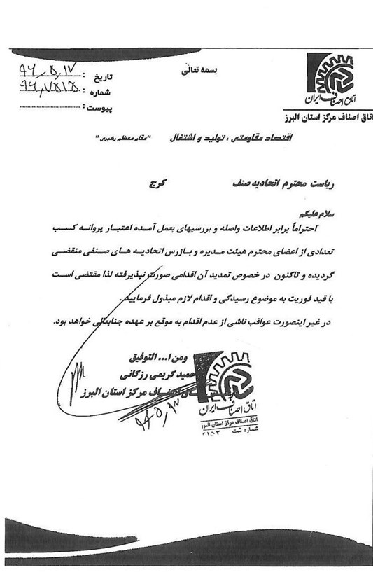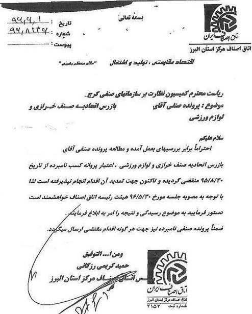 در پیگیری‌های مربوط به اصناف به نکته جالبی در این رابطه برخوردیم و آن اینکه علیرغم اتمام تاریخ اعتبار پروانه کسب بازرس هیئت مدیره اتحادیه خرازی و لوازم ورزشی کرج در مورخ 95/8/30 و عدم تمدید پروانه کسب، نه تنها واحد صنفی وی فعال بوده و برخورد قانونی صورت نگرفته بلکه در سمت حساس و مهم بازرس اتحادیه فعال بوده است.