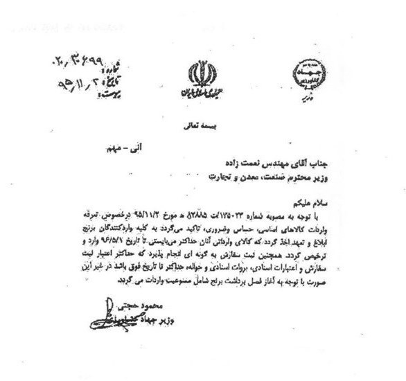بر اساس نامه حجتی وزیر جهاد کشاورزی به نعمت‌زاده وزیر صنعت، معدن و تجارت درباره مصوبه اخیر هیئت وزیران درباره کاهش تعرفه واردات کالاهای اساسی حساس و ضروری از وزارت صنعت، معدن و تجارت خواسته شده است که از وارد کنندگان برنج تعهد اخذ گردد که کالاهای وارداتی آنها حداکثر تا تاریخ ابتدای مرداد سال آینده به کشور وارد و ترخیص شود.