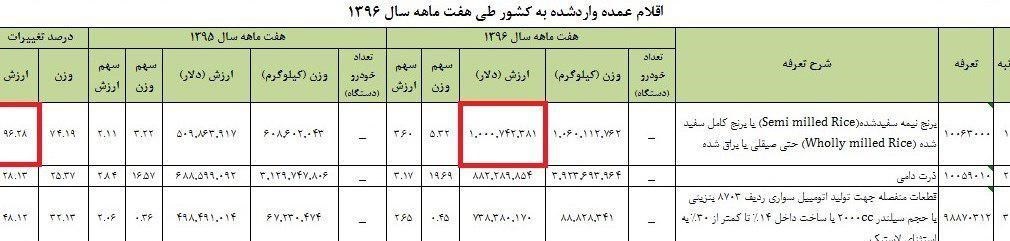بر اساس جدول بالا واردات برنج نسبت به مدت مشابه سال قبل به ‌لحاظ ارزش با رشد 96درصدی مواجه شده است. واردات برنج به‌لحاظ وزنی رشد 75 درصدی را تجربه کرده؛ گفتنی است حقوق ورودی برنج در ماه‌های اخیر از 40 به 26 درصد کاهش یافته است.