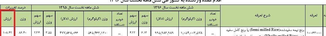 به این ترتیب واردات برنج در مقایسه با سال قبل به لحاظ وزنی 86 درصد و  به لحاظ ارزشی 108 درصد رشد داشته است.