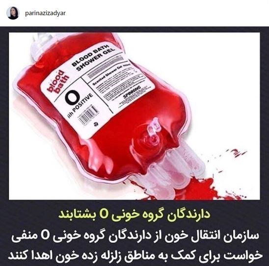 پریناز ایزدیار با انتشار تصویری از دارندگان گروه خونی -O خواست به مناطق زلزله زده خون اهدا کنند.