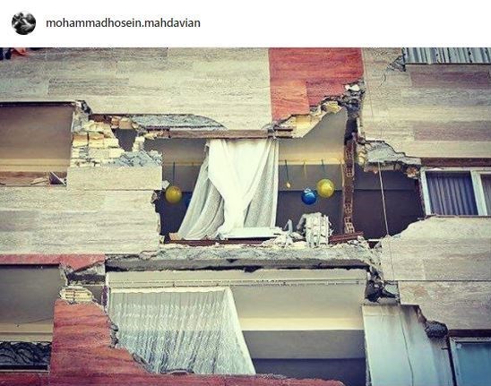 بیژن بنفشه خواه: زلزلهء هفت ریشترى در غرب ایران و شمال عراق.براى زلزله زده ها دعا کنیم.این عکس متعلق به قصر شیرین است و از پیج آخرین خبر برداشتم.
