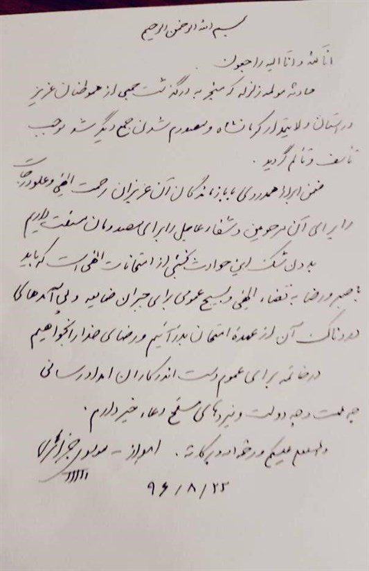 به همین مناسبت آیتالله سید محمدعلی موسویجزایری، نماینده ولی فقیه در استان خوزستان و امام جمعه اهواز در پیامی درگذشت جمعی از هموطنان در حادثه تلخ زمینلرزه استان کرمانشاه را تسلیت گفت.