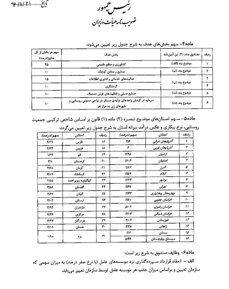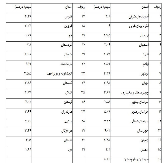 ماده 5- سهم استان های موضوع تبصره (2) ماده (1) قانون براساس شاخص ترکیبی جمعیت روستایی، نرخ بیکاری و عکس درآمد سرانه استان به شرح جدول زیر تعیین می گردد: