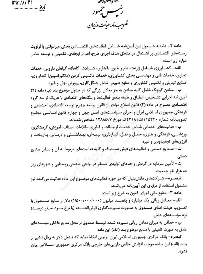 ب- قانون: قانون حمایت از توسعه و ایجاد اشتغال پایدار در مناطق روستایی و عشایری با استفاده از منابع صندوق توسعه ملی - مصوب 1396
