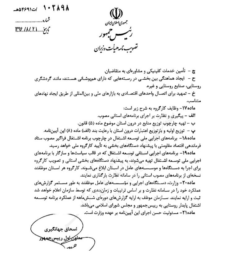 هیات وزیران در جلسه 1396.8.17 به پیشنهاد سازمان برنامه و بودجه کشور و با همکاری وزارت تعاون، کار و رفاه اجتماعی و معاونت توسعه روستایی و مناطق محروم کشور و به استناد ماده (7) قانون حمایت از توسعه و ایجاد اشتغال پایدار در مناطق روستایی و عشایری با استفاده از منابع صندوق توسعه ملی - مصوب 1396 - آییننامه اجرایی قانون یادشده را به شرح زیر تصویب کرد: