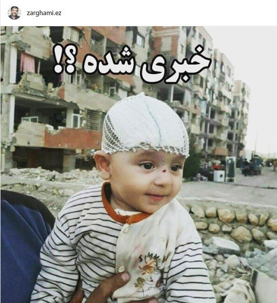 به گزارش گروه رسانه های خبرگزاری تسنیم، عزت الله ضرغامی با انتشار تصویری از یک کودک که در جریان زلزله کرمانشاه زنده از زیر آوار بیرون امده است در صفحه شخصی اینستاگرام نوشت: چیزی شده؟! ظاهرا ایشون از زیر آوار، زنده و سالم به بیرون تشریف آوردند!! مبارکه! خندهی زیبا و معصومانهاش حالمان را خوب کرد. اگر زبان داشت میپرسید، خبری شده؟!