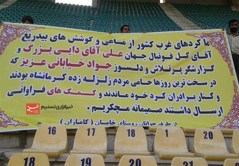 به گزارش خبرنگار ورزشی خبرگزاری تسنیم, در حاشیه دیدار امروز نفت تهران و سایپا در چارچوب مسابقات هفته دوازدهم لیگ برتر, چند تماشاگر از یکی از روستاهای شهر کامیاران کردستان با حضور روی سکوهای ورزشگاه تختی تهران و با در دست داشتن بنری, از علی دایی و جواد خیابانی بابت کمک و حمایتهایشان از مردم زلزلهزده کرمانشاه تقدیر و تشکر کردند.