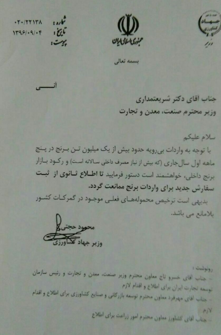 حجتی در این نامه از واردات یکمیلیون تن برنج در 5ماهه نخست امسال انتقاد و تأکید کرده است این رقم واردات بیش از نیاز مصرف داخلی سالانه است.