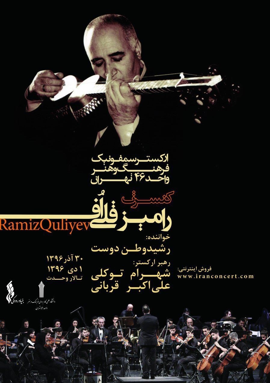 کنسرت ارکستر سمفونیک فرهنگ و هنر با همراهی رامیز قلیاف نوازنده مشهور تار و اهل کشور آذربایجان، در روزهای سی آذر و یکم دی 1396 از ساعت 21:30 در تالار وحدت برگزار میشود.