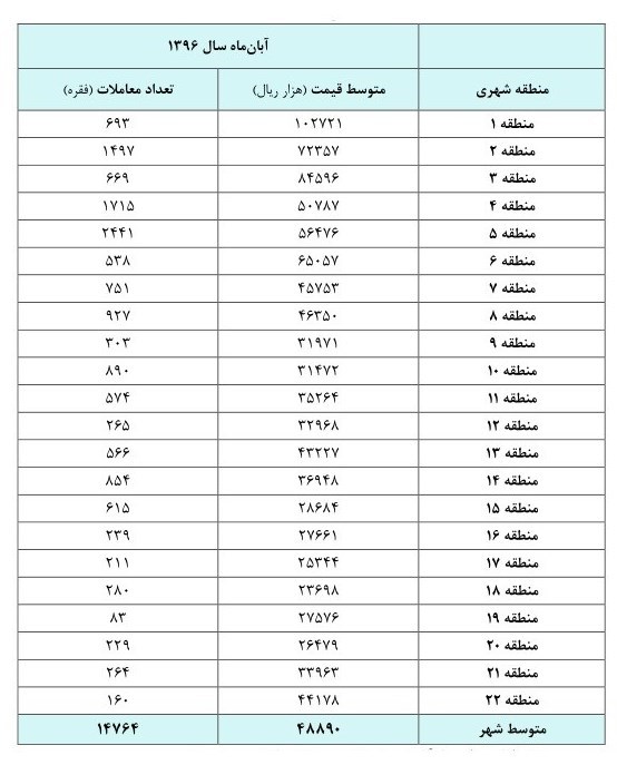 در منطقه 19 نرخ متوسط فروش هر مترمربع زیربنای واحد مسکونی 2 میلیون و 757 هزار تومان است. نرخ فروش مسکن در منطقه 20 به ازای هر مترمربع در جدیدترین آمار بانک مرکزی 2 میلیون و 647 هزار و در منطقه 21 و 22 به ترتیب 3 میلیون و 396 و 4 میلیون و 417 هزار تومان اعلام شده است. منطقه 18 نیز با متوسط قیمت فروش هر مترمربع 2 میلیون و 369 هزار تومان کمترین نرخ در بین مناطقه 22 گانه پایتخت در آبانماه سال جاری را داشته است.