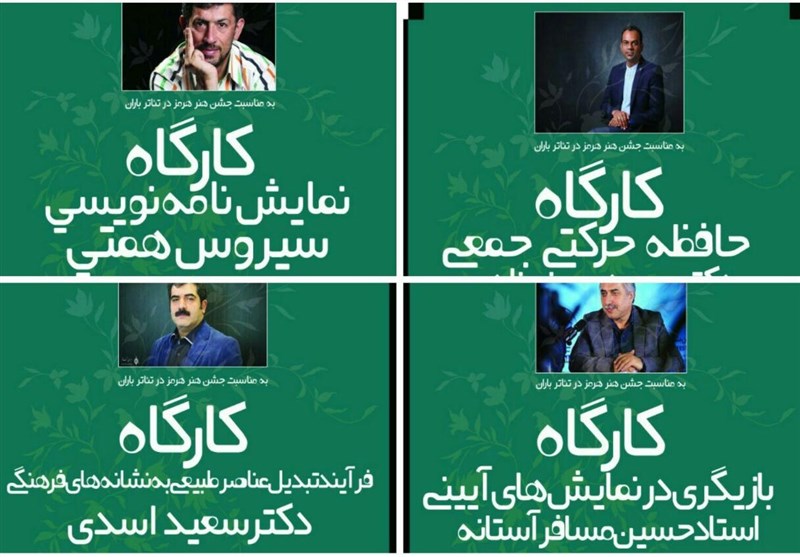کارگاههای هفته هنر هرمز با رویکرد «فرآیند تبدیل عناصر طبیعی به نشانههای فرهنگی» با هدایت دکتر سعید اسدی؛ کارگاه «بازیگری در نمایشهای آیینی» توسط حسین مسافرآستانه «هرمز، چشمانداز یک افسانه» توسط هادی کمالی مقدم، مینا بزرگ مهرنیا، «کارگاه نمایشنامهنویسی» توسط سیروس همتی، کارگاه مبانی بافت پیش مغ محمد سایبانی و کارگاه «حافظه حرکت جمعی» با هدایت دکتر مجید سرنیزاده در تئاتر باران برگزار میشود.
