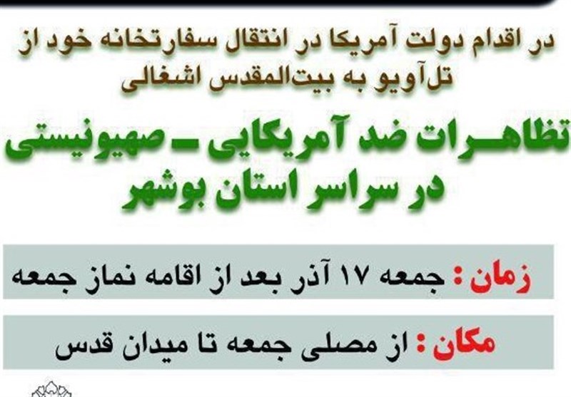 به گزارش خبرگزاری تسنیم از بوشهر، نصرالله شفیعی ظهر امروز در نشست برنامه ریزی برای برگزاری راهپیمایی ضد صهیونیستی ضد آمریکایی در استان بوشهر با بیان اینکه مردم انقلابی و ولایتمدار استان بوشهر به مواضع اخیر ترامپ در انتقال پایتخت به بیتالمقدس اشغالی پاسخ قاطعی میدهند اظهار داشت: در محکومیت اقدام ترامپ در انتقال سفارت آمریکا از تلآویو به بیت المقدس فردا پس از برپایی نماز جمعه راهپیمایی ضد صهیونیستی ضد آمریکایی در سراسر استان بوشهر برگزار میشود.