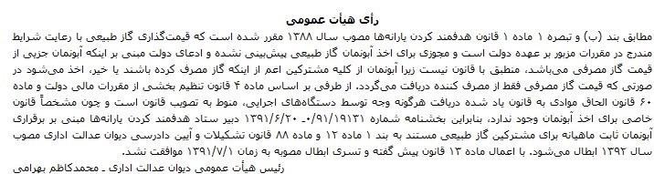 موضوع با اعلام نظر هیئت تخصصی اقتصادی، مالی و اصناف دیوان عدالت اداری مبنی بر اینکه بر مبنای بند ب و تبصره یک ماده 1 قانون هدفمند کردن یارانه ها قیمت گذاری گاز طبیعی با رعایت شرایط مندرج در مقررات مزبور بر عهده دولت بوده و مجوزی برای اخذ آبونمان گاز طبیعی پیش بینی نشده است، در دستور کار هیئت عمومی قرار گرفت و در هیئت عمومی بخشنامه مورد شکایت بر اساس ماده 4 قانون تنظیم بخشی از مقررات مالی دولت و ماده 60 قانون الحاق موادی به قانون یاد شده که دریافت هرگونه وجهی را توسط دستگاه‌های اجرایی منوط به رعایت مقررات قانونی کرده است، خلاف قانون تشخیص داده شد و ابطال شد.