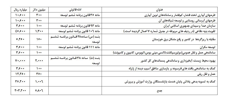 به منظور تحقق اهداف مندرج در قانون برنامه ششم توسعه، به دولت اجازه داده می شود براساس جدول زیر، نسبت به برداشت از ورودی سال 97 صندوق توسعه ملی اقدام و منابع حاصله را به ردیف درآمد عمومی به شماره طبقه بندی 310705 نزد خزانه داری کل کشور واریز نماید و اعتبارات موضوع این بند برای صندوق توسعه ملی بازگشت از منابع محسوب می شود. هر گونه پرداخت در غیر از موارد مشخص شده از جمله حقوق و دستمزد از محل منابع این بند ممنوع است. تبدیل دلار به ریال منابع موضوع این بند زیر نظر بانک مرکزی جمهوری اسلامی ایران صورت میگیرد.