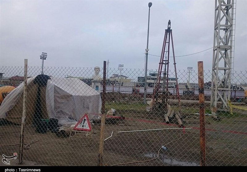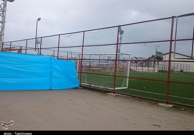 در بازی ملوان بندر انزلی برابر مس رفسنجان قسمت زیادی ازسکوهای ورزشگاه تخنی بندر انزلی تخریب شده است و کارگران در حال انجام عملیات آواربرداری هستند.