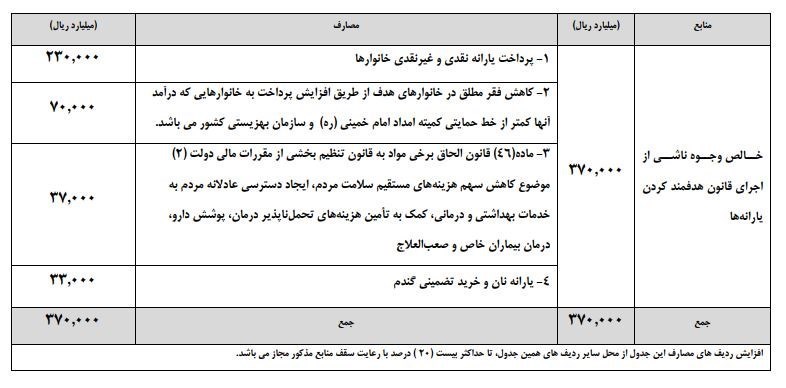 توضیح آنکه علیرغم تصریح ماده (39) قانون برنامه ششم توسعه به درج «کل دریافتیهای حاصل از اجرای قانون هدفمند کردن یارانهها» در ستون دریافتیها (در راستای افزایش شفافیت مالی اجرای هدفمندی و انضباط مالی کشور)، ولی آنچه در لایحه ذیل ستون دریافتیها آورده شده است، صرفاً «خالص وجوه ناشی از اجرای قانون هدفمند کردن یارانهها» است که تنها سهم سازمان هدفمندی یارانهها از «کل دریافتیهای حاصل از اجرای قانون هدفمندکردن یارانهها» میباشد. به بیان دیگر براساس حکم ماده (39) قانون برنامه ششم توسعه، دولت موظف است به منظور ایجاد شفافیت و امکان نظارت، همه منابع حاصل از فروش داخلی نفت خام، میعانات گازی، آب، برق و گاز طبیعی را در لایحه بودجه گزارش کرده و سهم سازمان هدفمندسازی را در ردیف 210112 در قسمت منابع عمومی بودجه درج کند. با این کار اصل پنجاه و سوم قانون اساسی نیز اجرایی خواهد شد و اصل شفافیت بودجه نیز تا حدود زیادی تحقق مییابد.