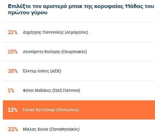 این رسانه ورزشی یونان سیستم تاکتیکی 3 - 3 - 4 را برای معرفی تیم منتخب نیمفصل اول سوپر لیگ فوتبال این کشور در نظر گرفت و شش بازیکن در هر پستی نامزد هستند. در بخش مدافعان چپ نام احسان حاجصفی، ملیپوش ایرانی تیم پانیونیوس نیز دیده میشود که تاکنون 12 درصد آرای مخاطبان سایت SDNA یونان را دریافت کرده است.