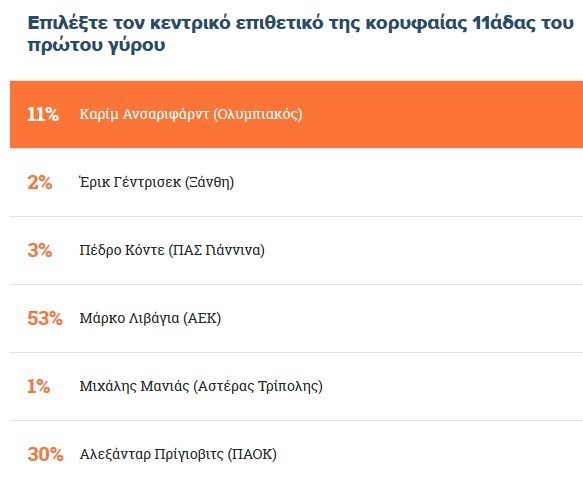 در بخش مهاجمان نیز نام کریم انصاریفرد از تیم المپیاکوس در صدر قرار گرفته است. این ملیپوش ایرانی نیز تاکنون توانسته 11 درصد آرای هواداران فوتبال یونان را از آن خود کند.