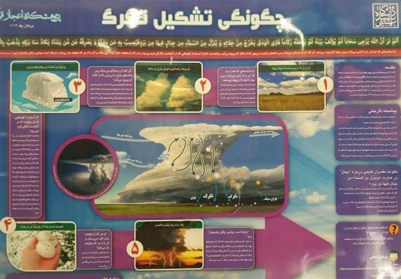 در این مراسم براتی با اشاره به آیه43 سوره نور به وجه تشابه ابرهای تشکیلدهنده تگرگ و کوهها را بیان کرد و گفت: دادههای قرآن در این آیه با علم تطابق دارد؛ خداوند در بخشی از آیه43 سوره نور میفرماید: «أَ لَمْ تَرَ أَنَّ اللَّهَ یُزْجی سَحاباً ثُمَّ یُؤَلِّفُ بَیْنَه؛ آیا ندانستهاى که خدا[ست که] ابر را به آرامى مىراند، سپس میان [اجزاء] آن پیوند مىدهد» این قسمت از آیه رانش ابرها و پیوند میان آنها را بیان میکند که از منظر علم معادل با مرحله اتصال ابرهای کوچک کومولوس با یکدیگر است.