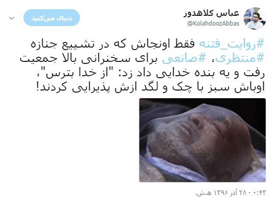 روایت فتنه فقط اونجاش که در تشییع جنازه منتظری، صانعی برای سخنرانی بالا جمعیت رفت و یه بنده خدایی داد زد: "از خدا بترس"، اوباش سبز با چک و لگد ازش پذیرایی کردند!