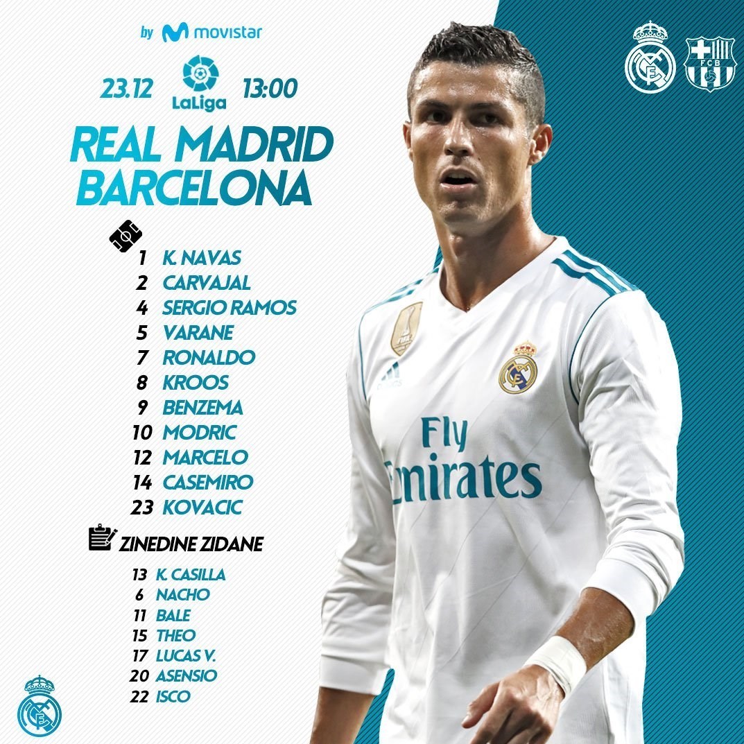 به گزارش خبرگزاری تسنیم، تیمهای فوتبال رئال مادرید و بارسلونا از ساعت 15:30 امروز (شنبه) در هفته هفدهم لالیگای اسپانیا در ورزشگاه سانتیاگو برنابئو به مصاف هم میروند. در آستانه شروع این الکلاسیکو ترکیب مدنظر زینالدین زیدان و ارنستو والورده مشخص شد.