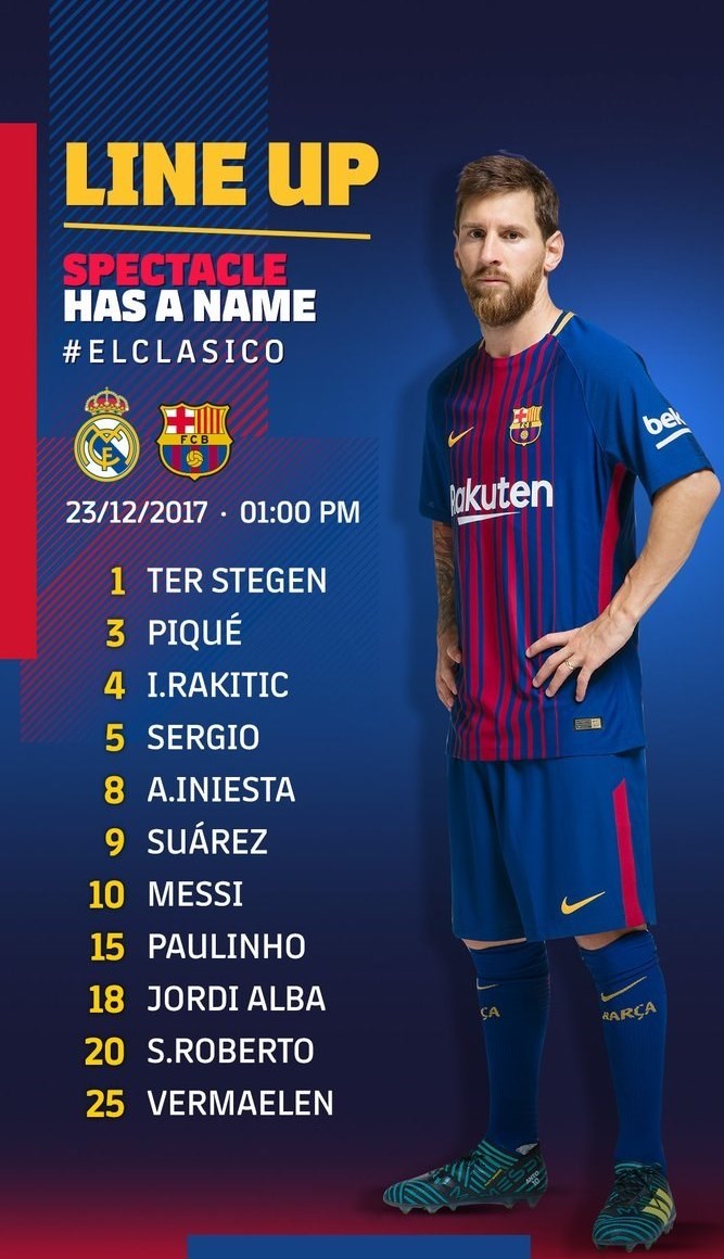 ترکیب بارسلونا: تراشتگن، روبرتو، پیکه، فرمائلن، آلبا، راکیتیچ، بوسکتس، پائولینیو، اینیستا، مسی و سوارس