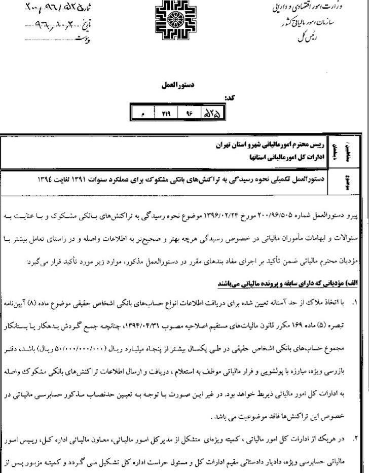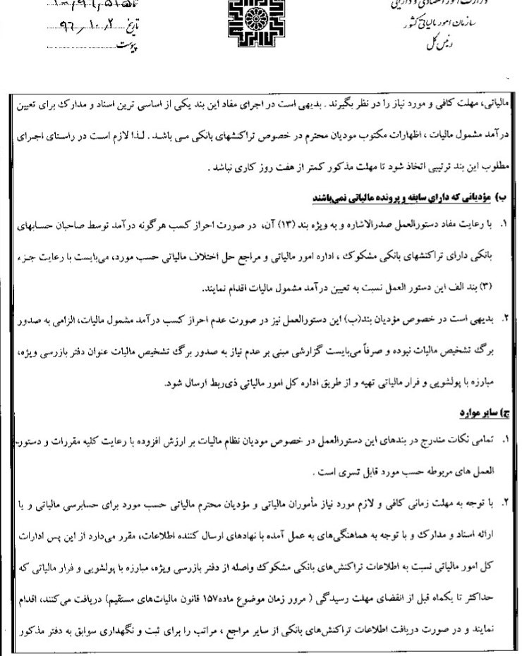 در بخشی از این ابلاغیه در راستای رسیدگی بهتر و سریع تر به اطلاعات واصله و تعامل بیشتر با مودیان آمده است، با اتخاذ ملاک از حد آستانه تعیین شده برای دریافت اطلاعات انواع حسابهای بانکی اشخاص حقیقی موضوع ماده (8) آیین نامه تبصره (5) ماده 169 مکرر قانون مالیات های مستقیم چنانچه جمع گردش بدهکار یا بستانکار مجموع حسابهای بانکی اشخاص حقیقی در طی یکسال بیشتر از 50 میلیارد ریال باشد، دفتر بازرسی ویژه مبارزه با پولشویی و فرار مالیاتی موظف به استعلام، دریافت و ارسال اطلاعات تراکنش های بانکی مشکوک واصله به ادارات کل امور مالیاتی ذیربط خواه بود. در غیر اینصورت با توجه به تعیین حد نصاب مذکور حسابرسی مالیاتی در خصوص این تراکنشها فاقد موضوعیت است.