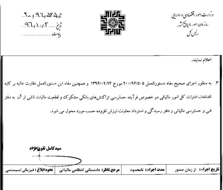 به گزارش خبرنگار اقتصادی خبرگزاری تسنیم، رییس کل سازمان امور مالیاتی کشور دستورالعمل تکمیلی نحوه رسیدگی به تراکنشهای بانکی مشکوک برای عملکرد سالهای 91 تا 94 را ابلاغ کرد.