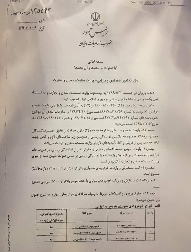 در تبصره 1 دستورالعمل جدید واردات خودرو آمده است: در موارد استثنایی، ورود و حقوق ورودی خودروهای سواری بنزینی و دیزلی با حجم موتور بالاتر از 2500 سیسی توسط هیأت وزیران تعیین خواهد شد و ورود خودروهای سواری هیبریدی با حجم موتور بالاتر از 2500 سیسی با تصویب هیئت وزیران مشمول حقوق ورودی است.