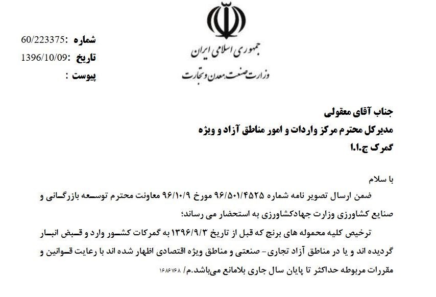 به گزارش خبرنگار اقتصادی خبرگزاری تسنیم، با بخشنامه جدید وزارت صنعت، ترخیص کلیه محموله های برنج که قبل از تاریخ 3 آذر 96 به گمرکات کشور وارد و قبض انبار گردیده اند، آزاد شد.