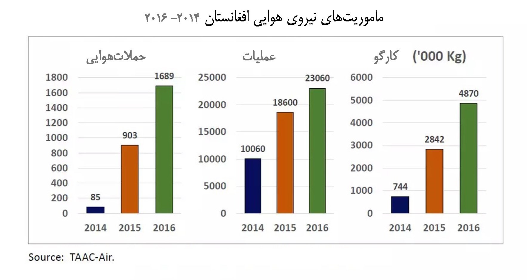از سوی نیز اطلاعات منتشر شده توسط «فرماندهی آموزش، مشاوره و کمک» به نیروی هوایی افغانستان نشان می‌دهد که این نیروها فعالیت‌های خود را در زمینه‌های حملات هوایی، عملیات‌های دیگر و انتقال محموله‌ها به شدت افزایش داده است.
