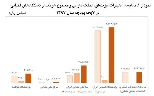 در مورد بخش فضایی کشور، پژوهشگاه فضایی ایران، سازمان فضایی ایران، بخش فضایی وزارت ارتباطات و پژوهشگاه هوافضا، به ترتیب بیشترین سهم بودجهای (سر جمع اعتبارات هزینهای و تملک دارایی) را در لایحه بودجه سال 97 کل کشور، دارا هستند اما سر جمع کل اعتبارات بخش هوافضا در لایحه بودجه سال آینده، رقم 3,655 میلیارد ریال را نشان میدهد که طبق اعلام مرکز پژوهشهای مجلس، این رقم 2 درصد نسبت به قانون بودجه سال 96 افزایش داشته و این رقم، از کل بودجه عمومی درج شده در لایحه بودجه سال 97، حدوداً 1 درصد محاسبه شده است.