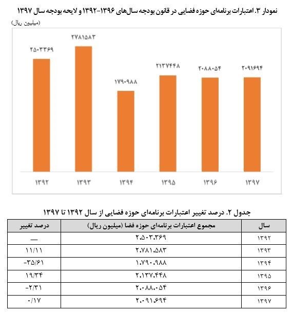 کارشناسان مرکز پژوهش های مجلس در گزارش رسمی این مرکز اعلام کردهاند که، سهم اعتبارات بخش هوافضای کشور طی سالهای 1392 تا 1396 روندی نزولی داشته ولی لایحه بودجه سال 97 در حدود 1 درصد رشد را در روند کلی، نشان میدهد.
