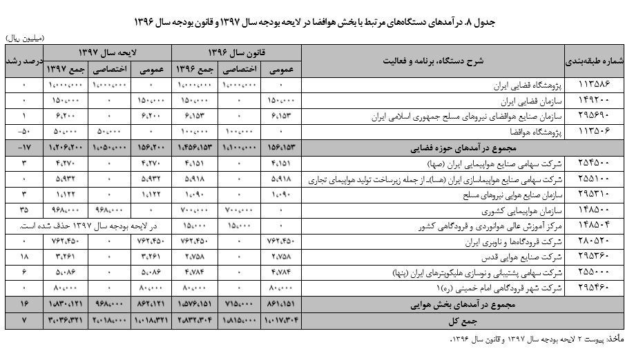 نکته قابل توجه اینکه، دولت در لایحه بودجه سال 97، در مجموع درآمدهای حاصل از "بخش هوافضا"، بیش از 3,036 میلیارد ریال را پیش بینی کرده که این رقم به نسبت سال 96، افزایش 7 درصدی را نشان میدهد.
