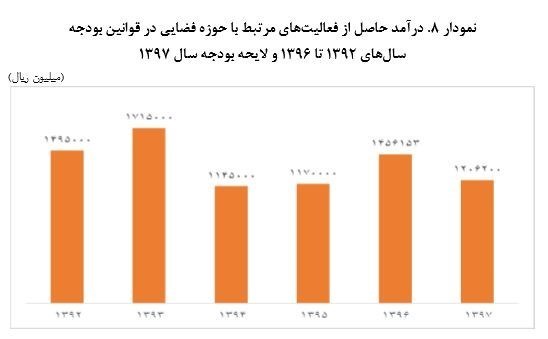 مجموع درآمدهای حوزه فضایی کشور در لایحه بودجه 97 کل کشور، بالغ بر 1,206 میلیارد ریال پیش بینی شده که این رقم به نسبت قانون بودجه سال 96، حدود 17 درصد کاهش داشته است. این میزان درآمد به نسبت درآمد سالهای 96، 93 و 92 برای بخش فضایی پیش بینی شده بود، کاهش چند درصدی را نشان میدهد اما همین درآمد، از میزان درآمد سالهای 95 و 94 بیشتر است.